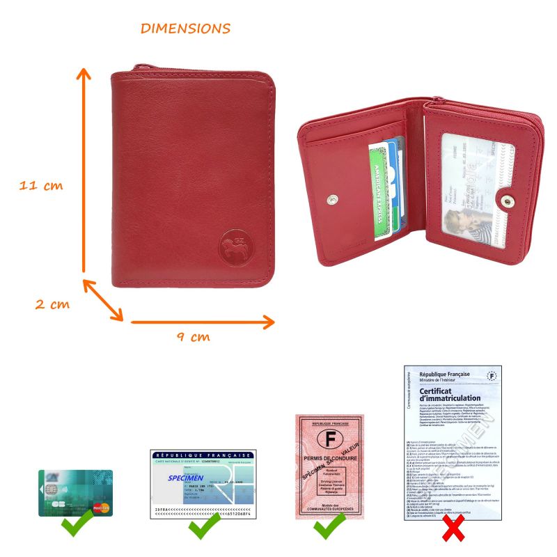 - Emplacement : 3 Cartes format bancaire, Pièce d’identité, Permis conduire, Billet, Poche zippée et Porte-monnaie zippé.