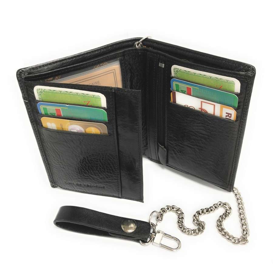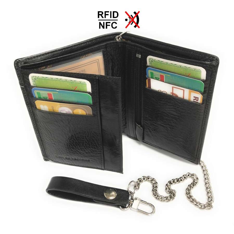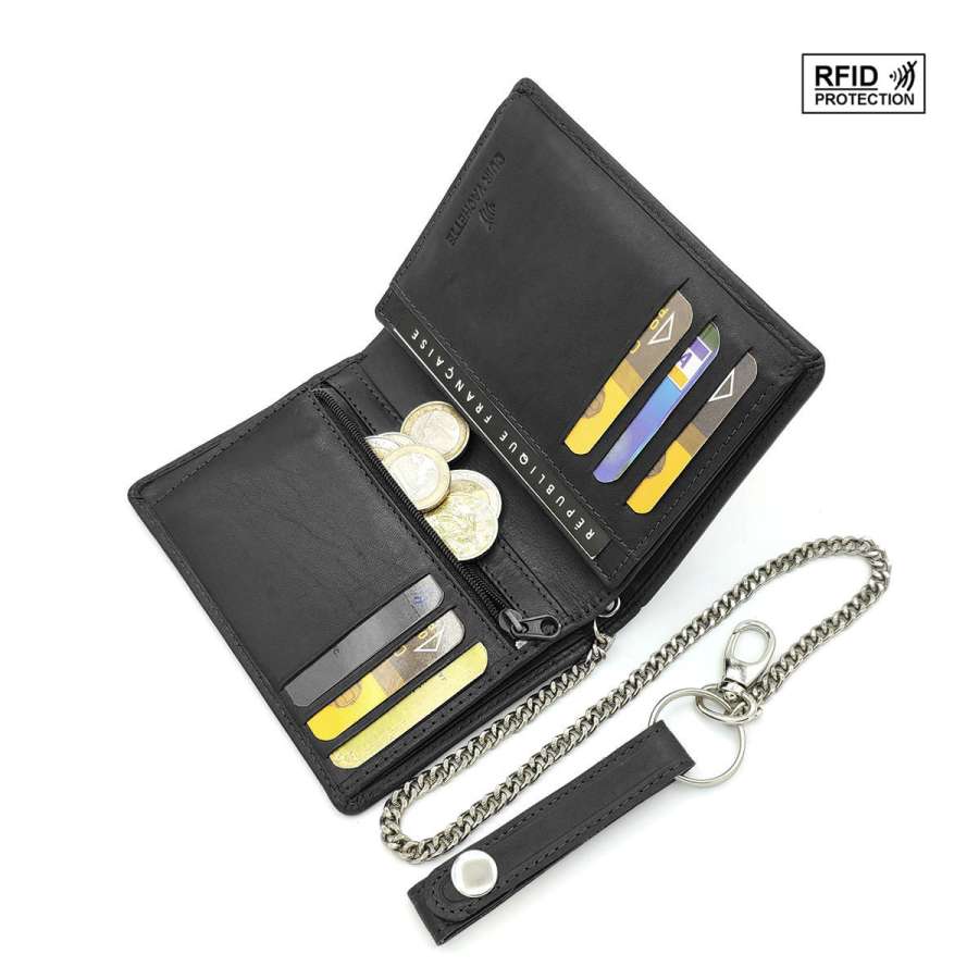 Portefeuille biker homme cuir véritable RFID-NFC avec chaîne en métal, pour cartes, permis, identité, billet et monnaie