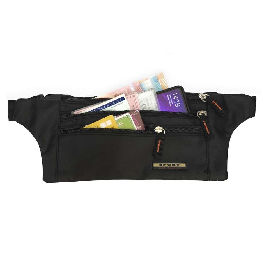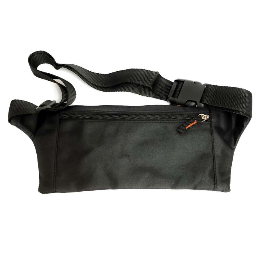 Sac banane, ceinture de voyage ou sport, leger, compact et plat, pour passeport, billets, smartphone, cartes, monnaie et clés (Noir)