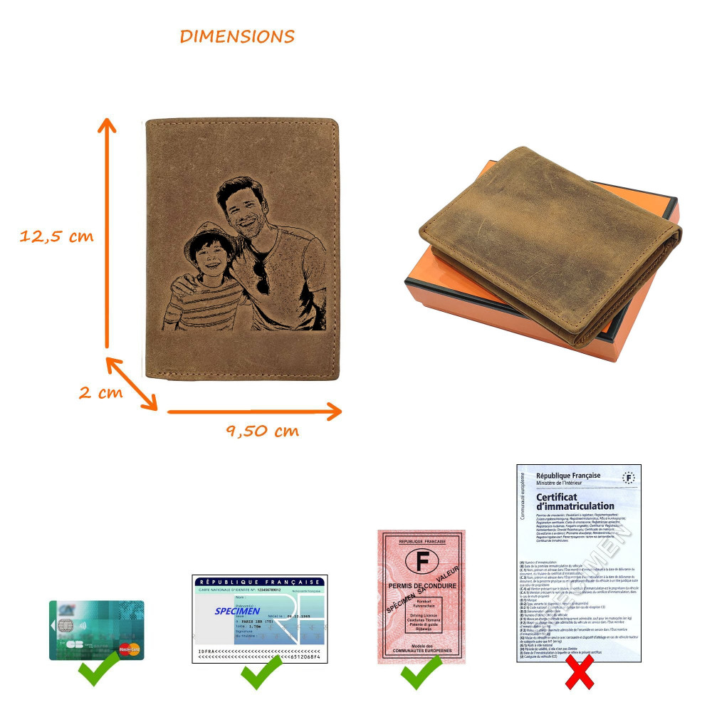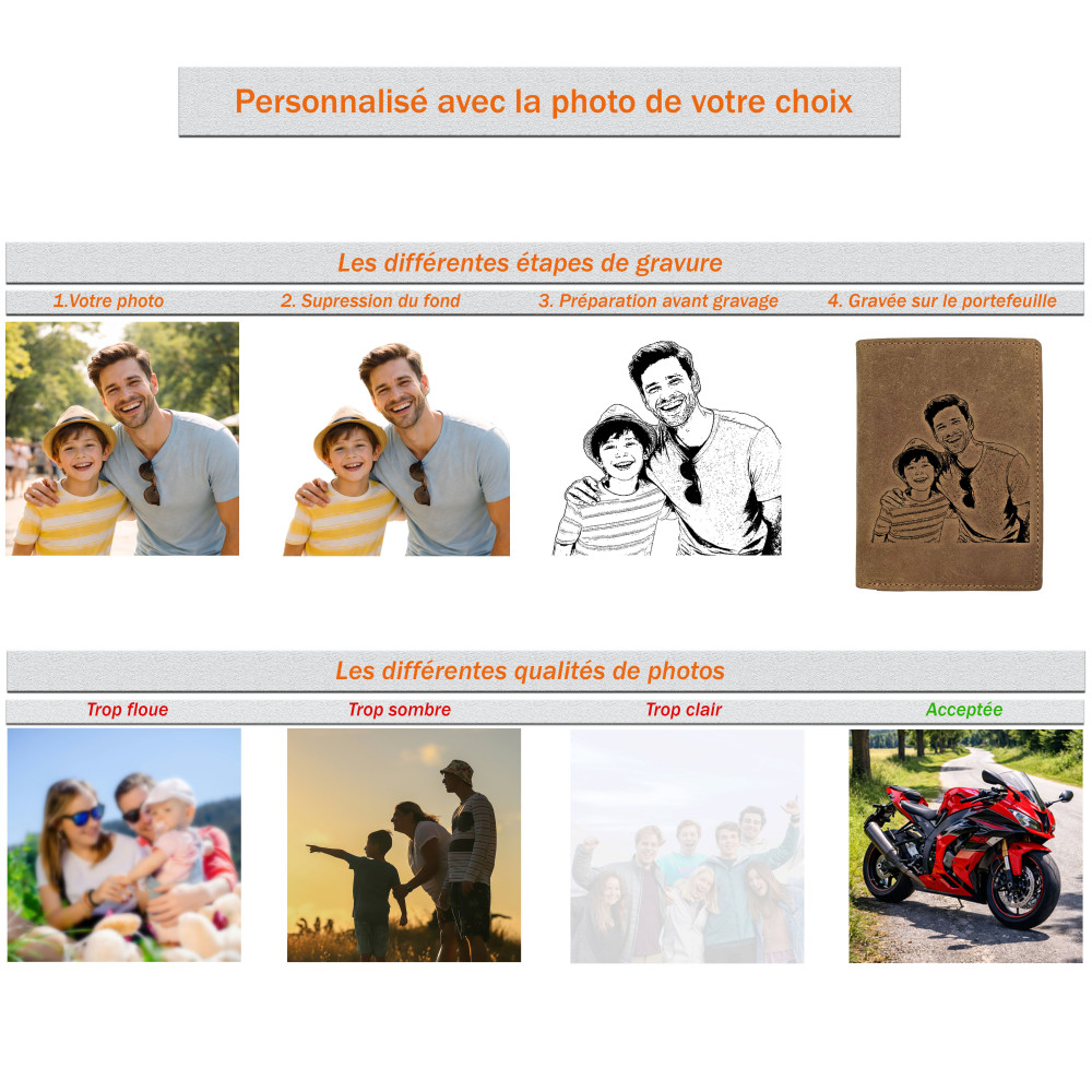 - [Personnalisation Gratuite - Gravé en France] : Votre photo sélectionnée est gravée au laser avec précision, gravure fine et durable dans le cuir. Chaque portefeuille devient ainsi une pièce exclusive, unique, élégant et chargé d’émotion, créé spécialement pour vous ou vos êtres chers.